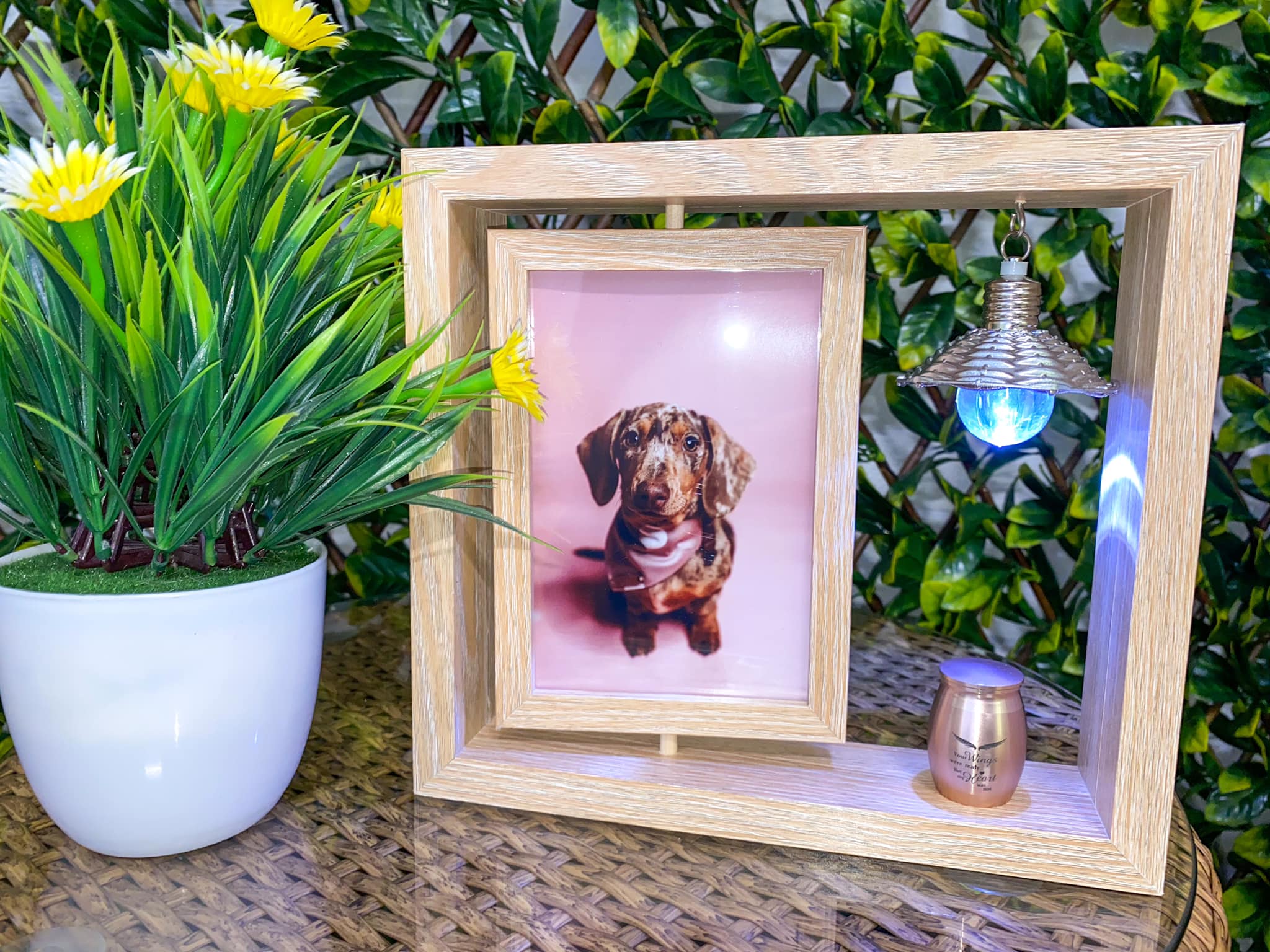 Hand crafted timber photo frames with the ashes of your beloved pet in the rear and your special photo placed in the front. The handcrafted box can be displayed as portrait or landscape.
