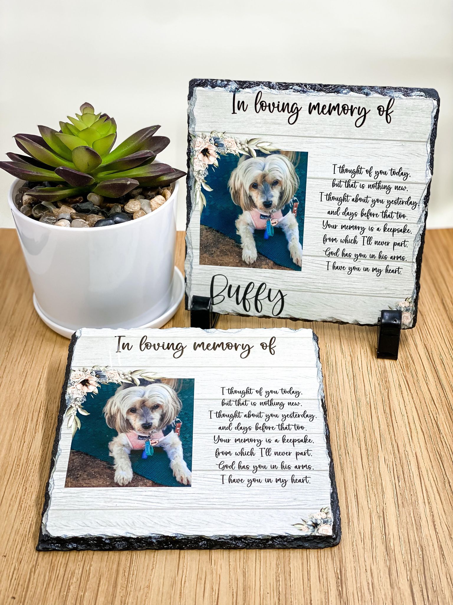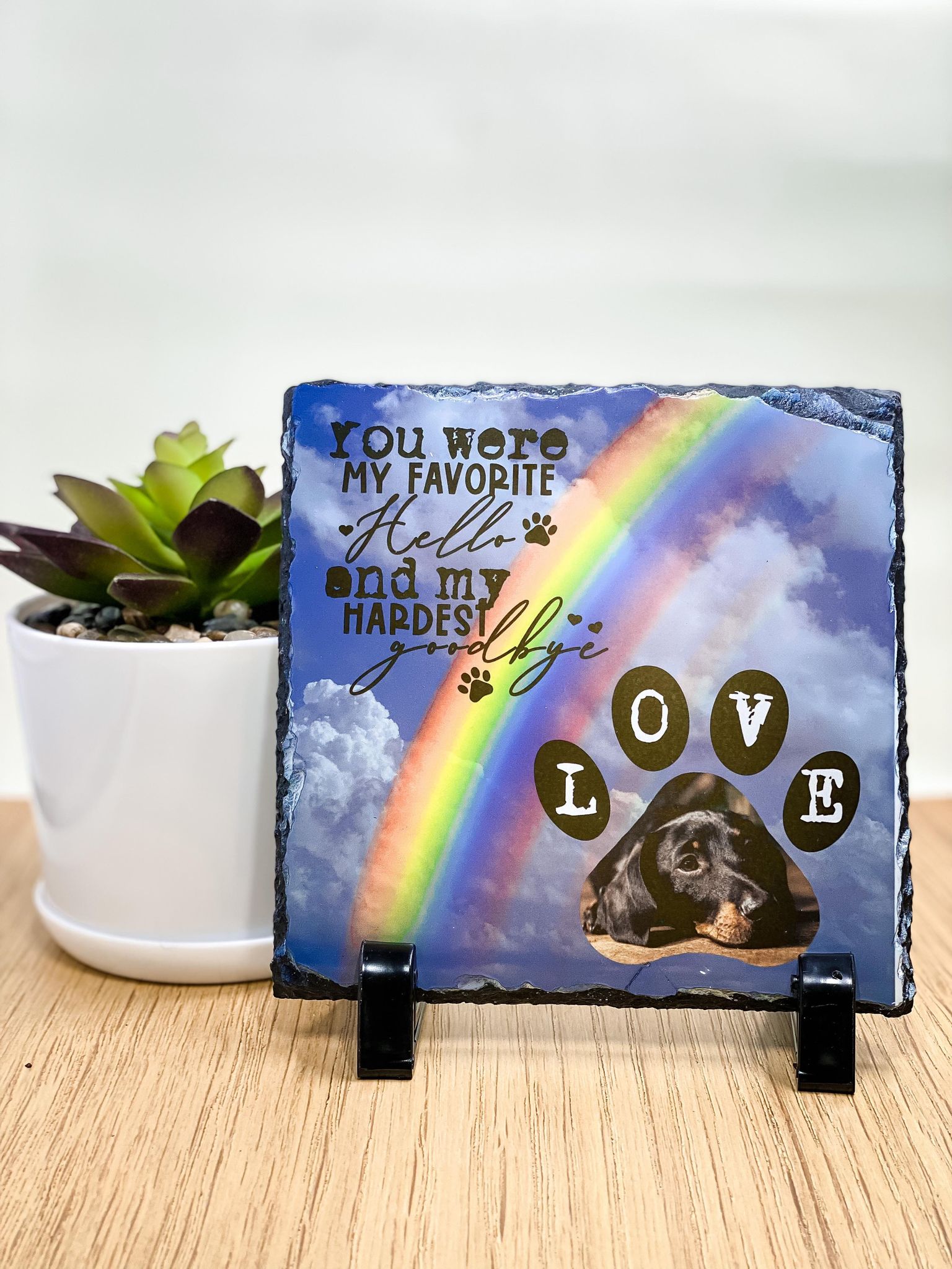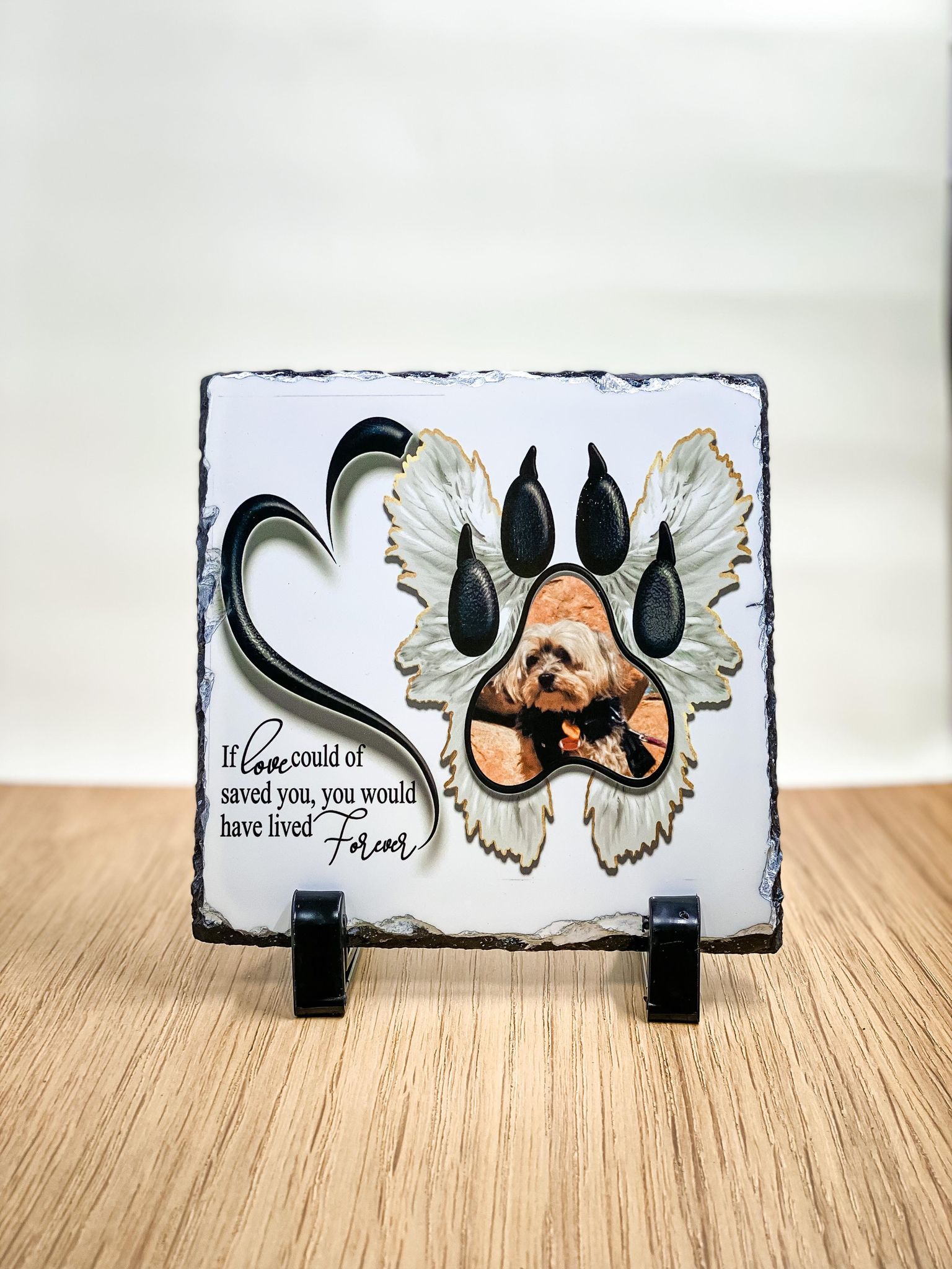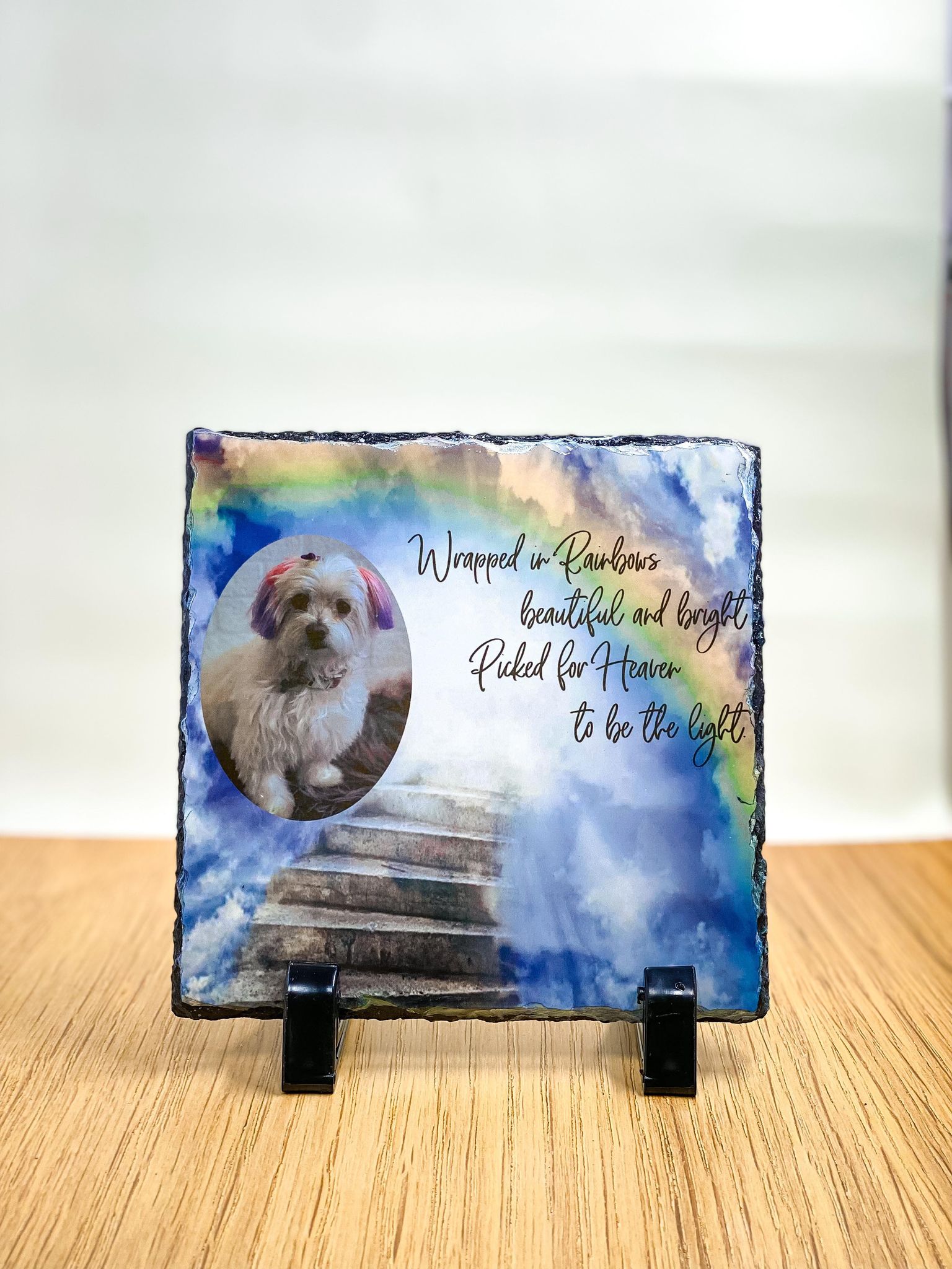 – Remember to let us know if you want to add a ‘personalisation’ if you want any text on your slate eg:Your pet’s name and dates/years.