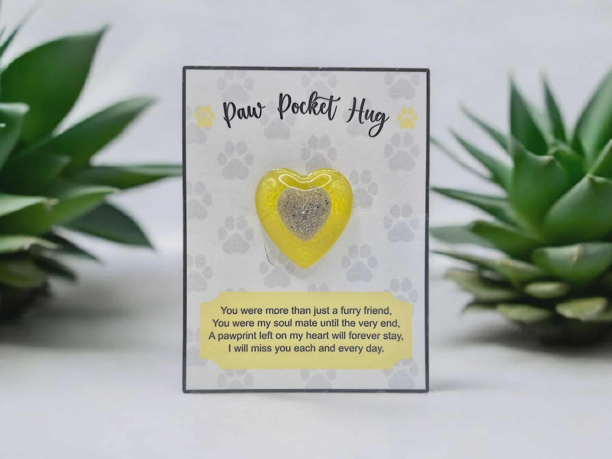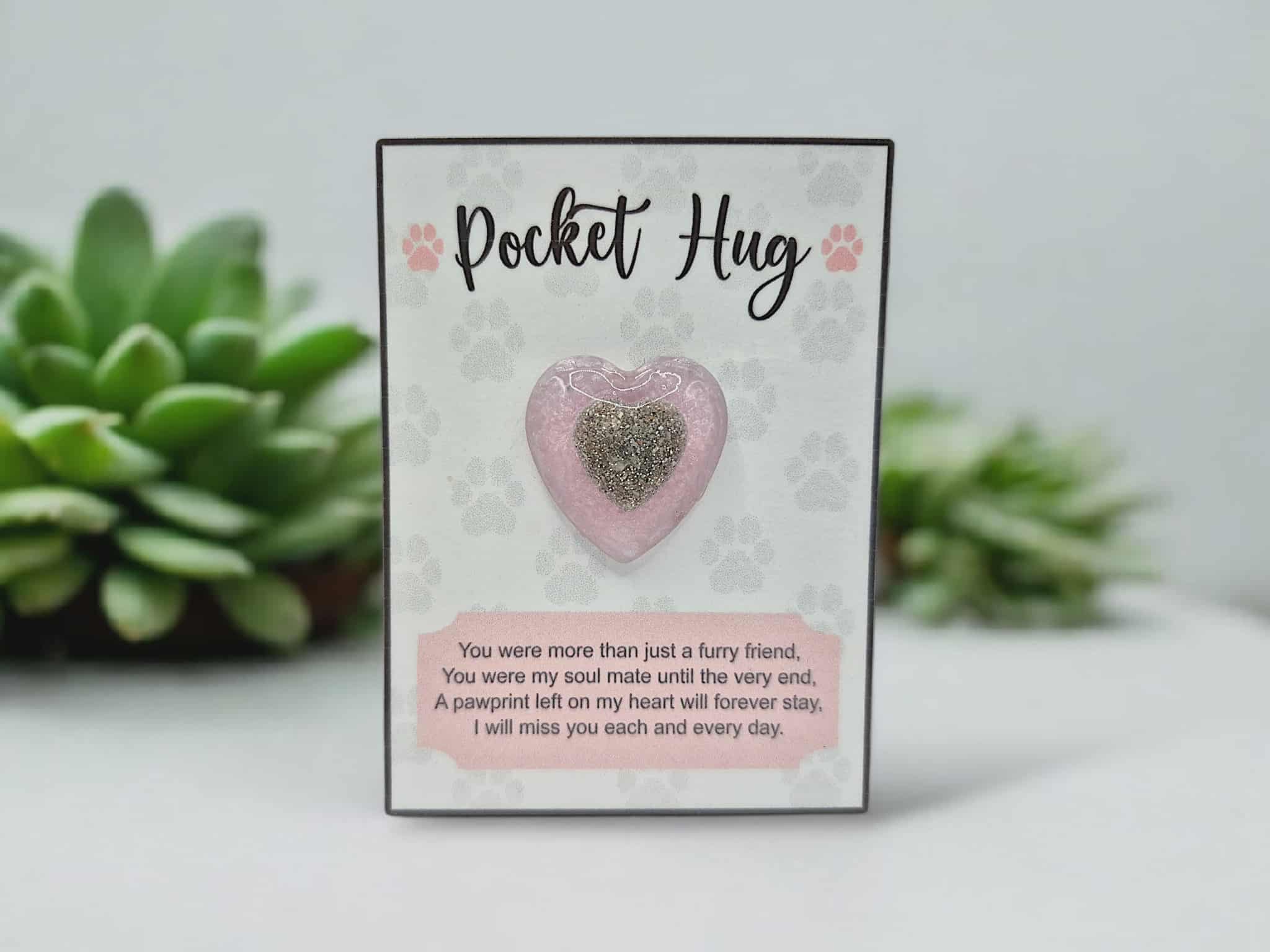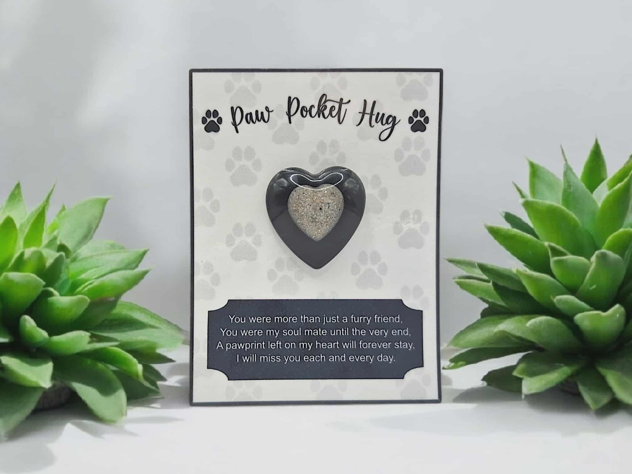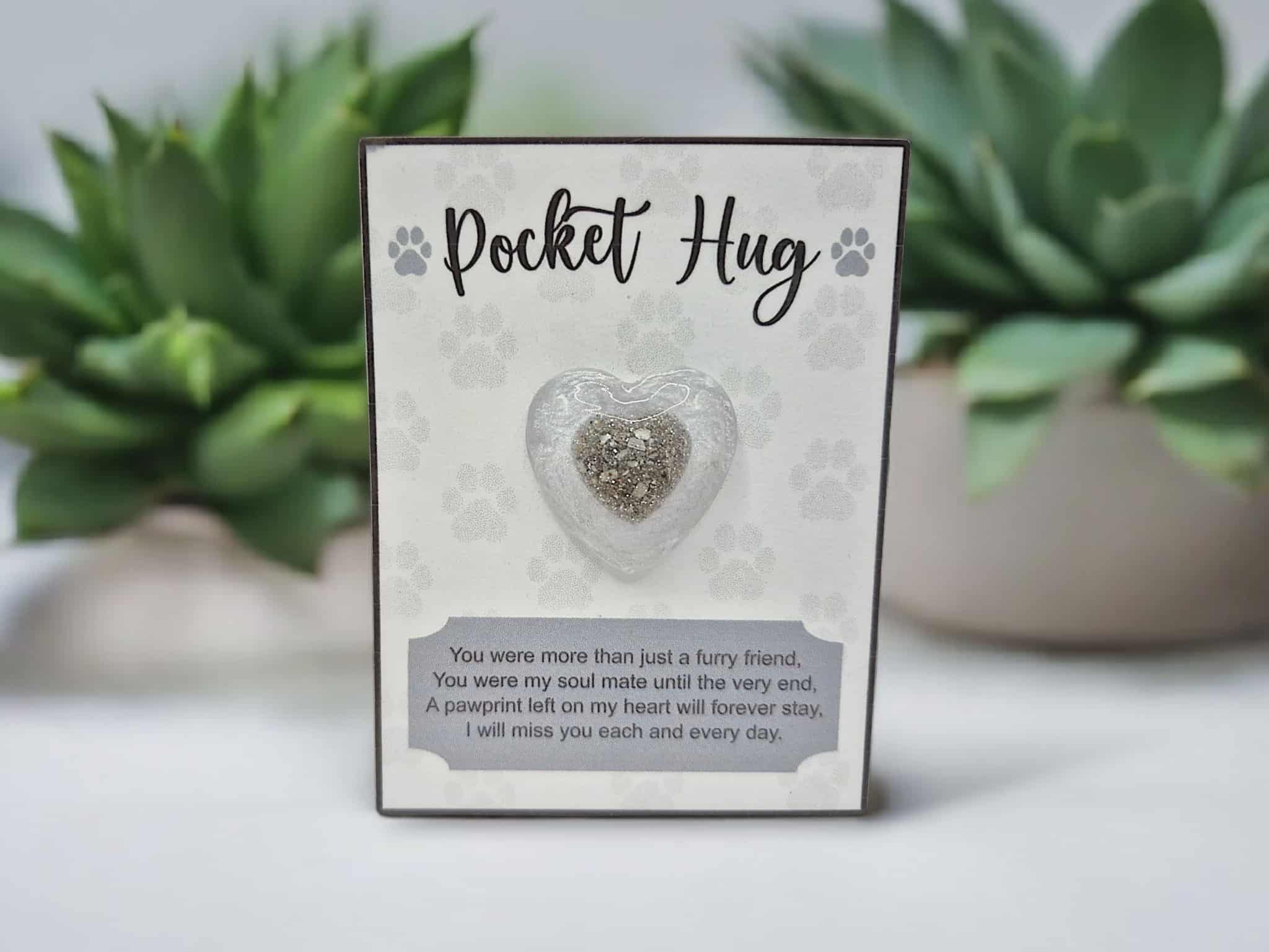 Each Pocket Hug is carefully handcrafted from resin and infused with your beloved pet’s cremains. The design features a small heart created with ashes and resin, placed within a larger coloured resin heart. This symbolic embrace represents your pet held safely and lovingly, forever close to you.