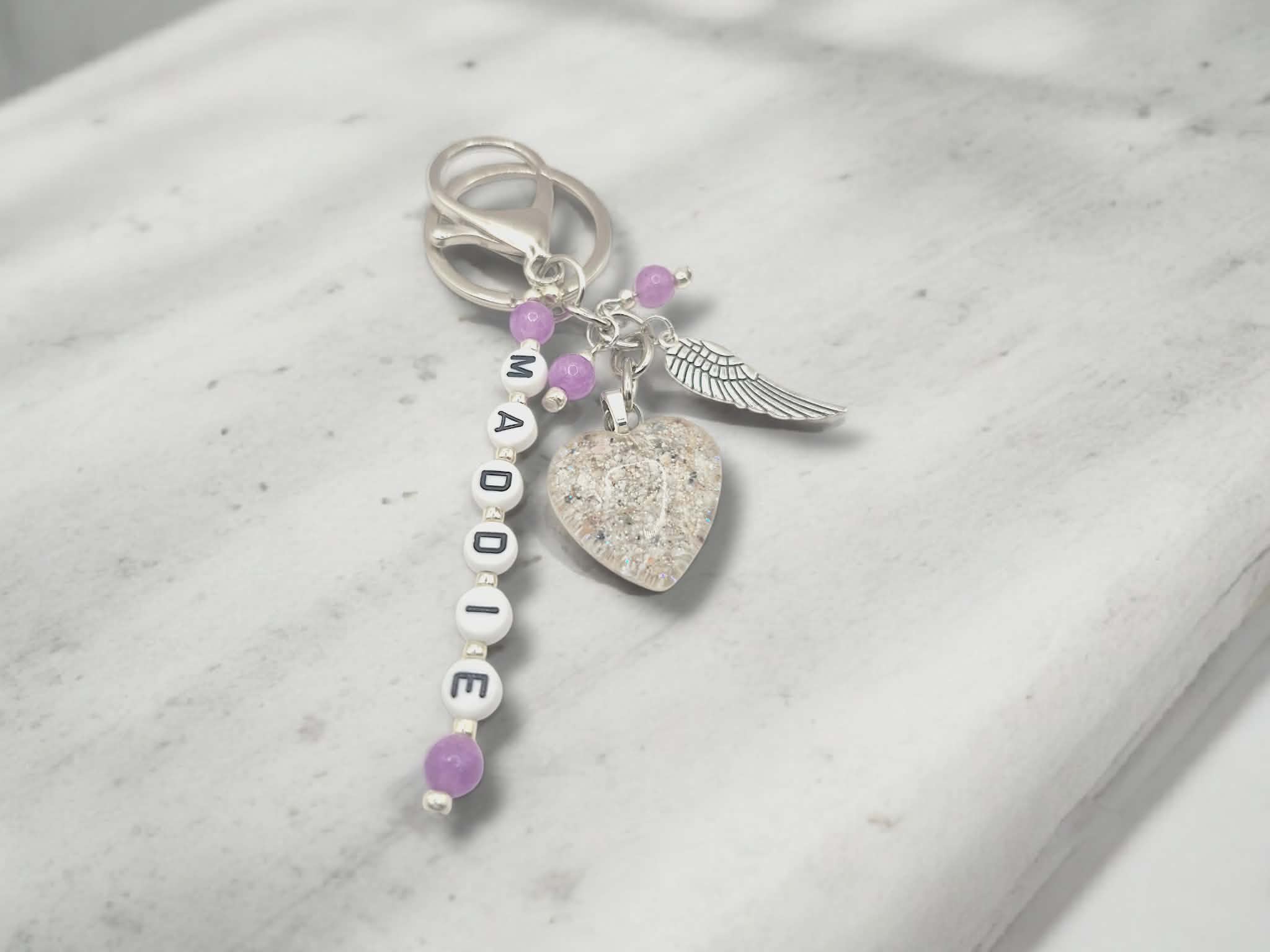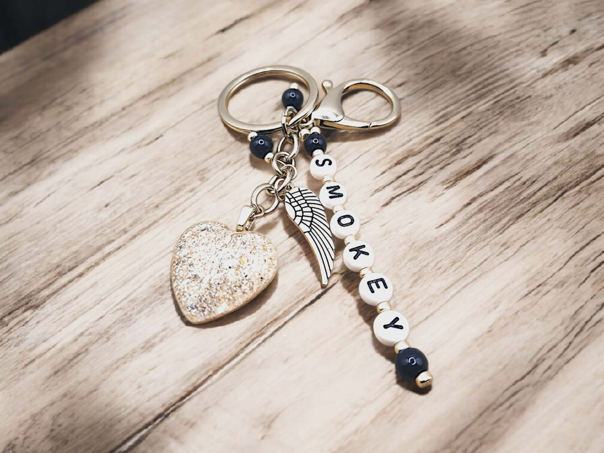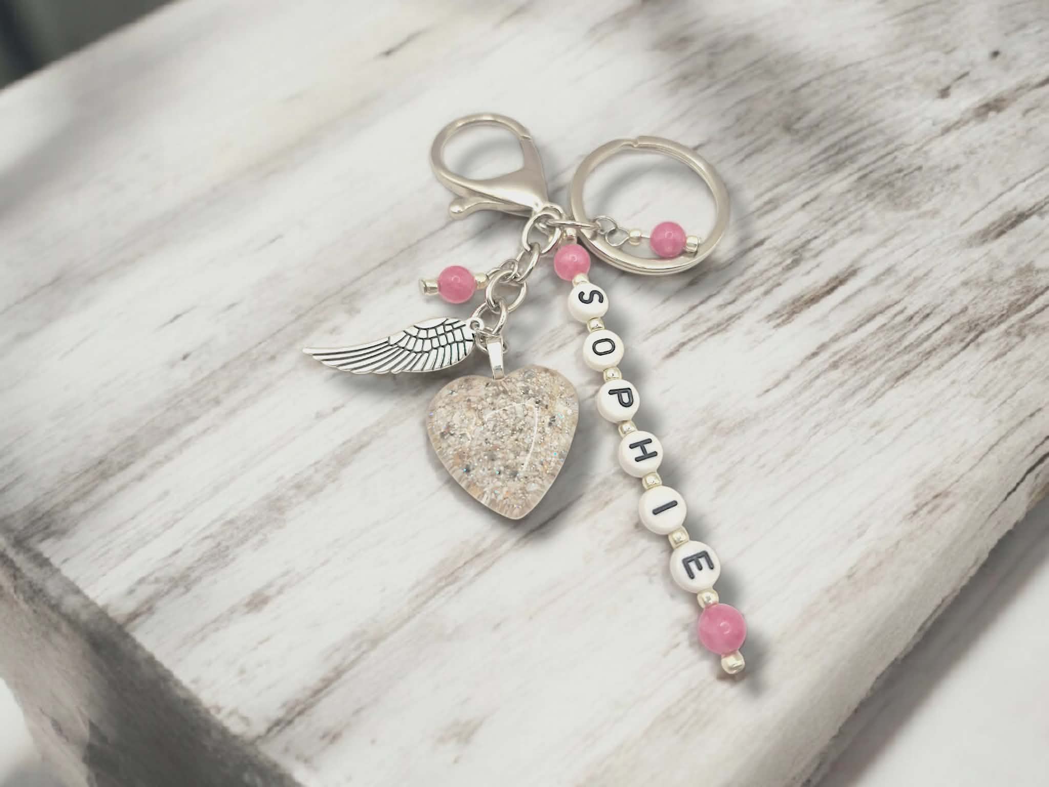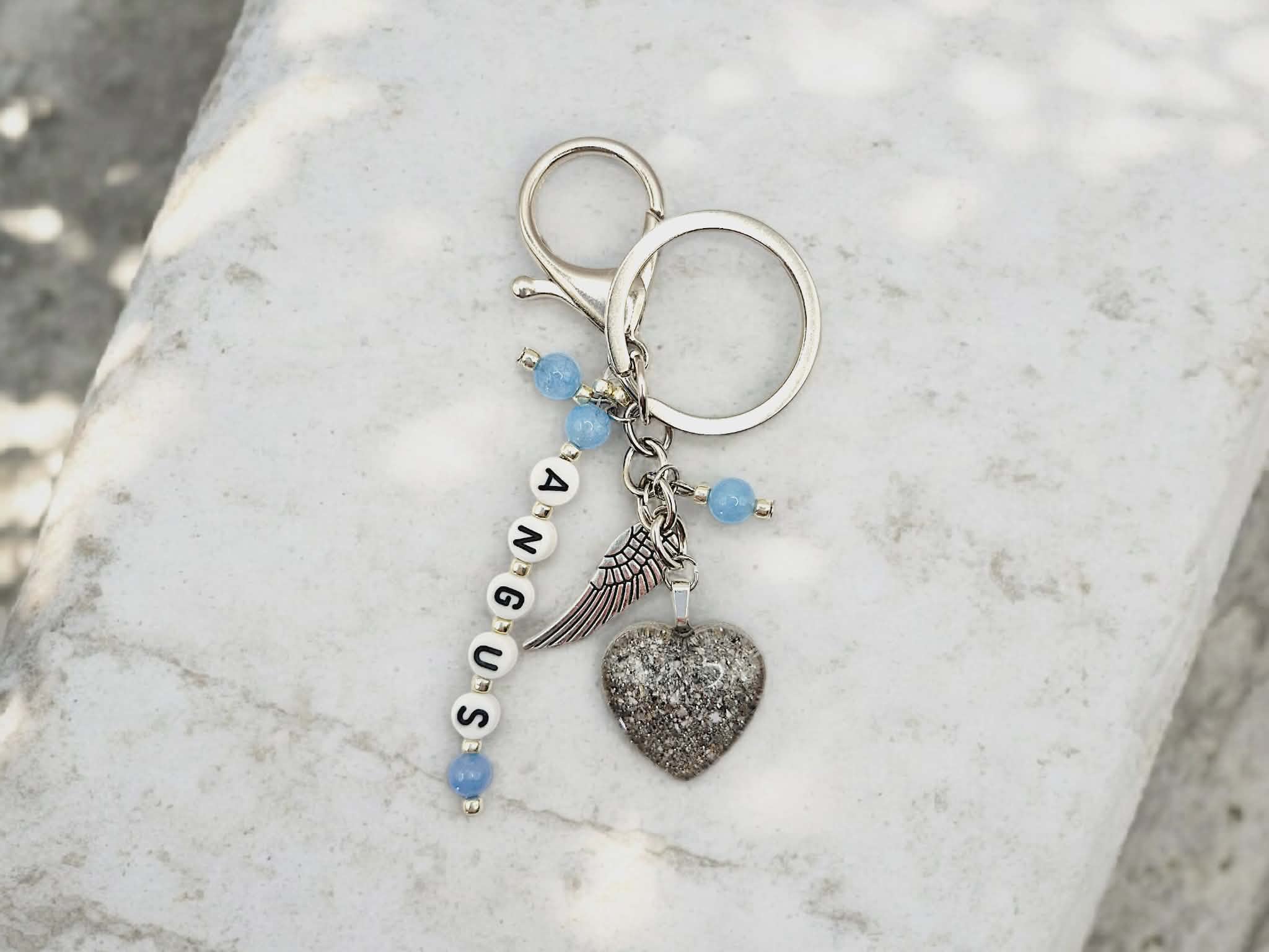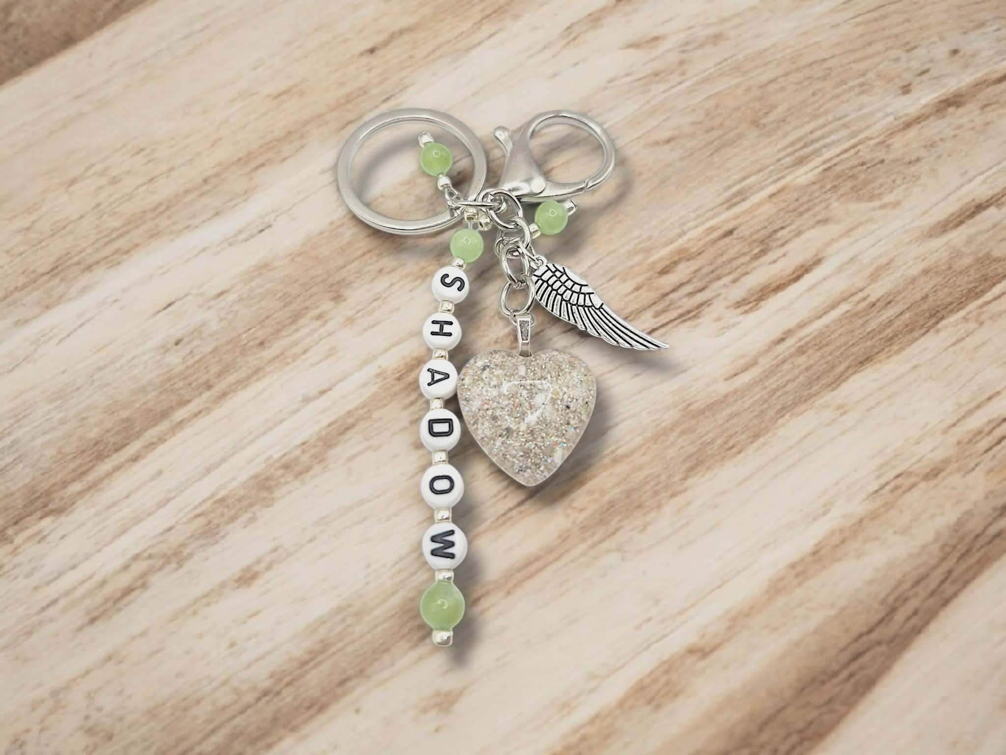 Each keyring is lovingly created by hand and includes your pet’s name spelled in individual letter beads, along with a resin heart delicately infused with a small portion of their ashes and a light sprinkle of sparkle — a soft shimmer that symbolises their everlasting light.